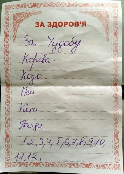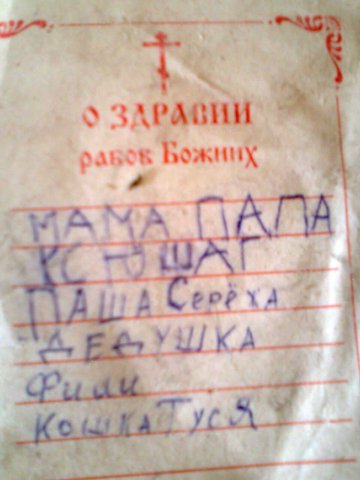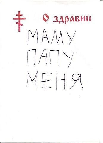 Умилительная записка. Какой-то добрый малыш, только что научившийся писать, не забыл включить в список поминаемых кошку Тусю.