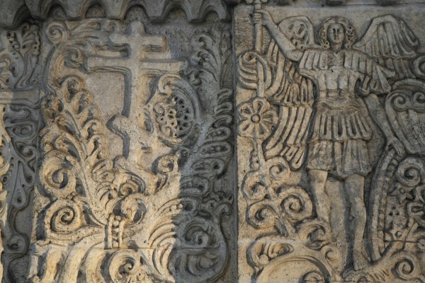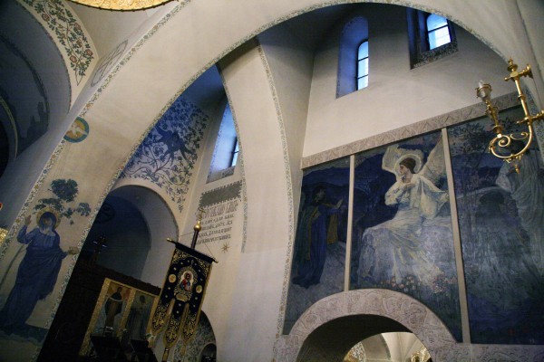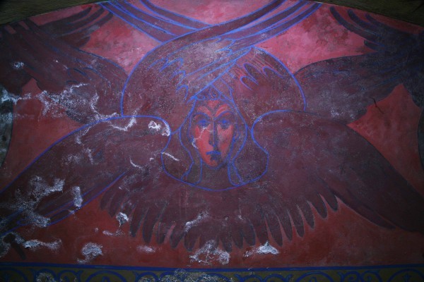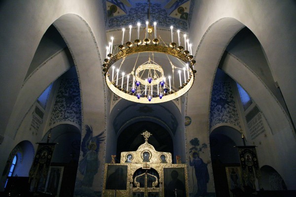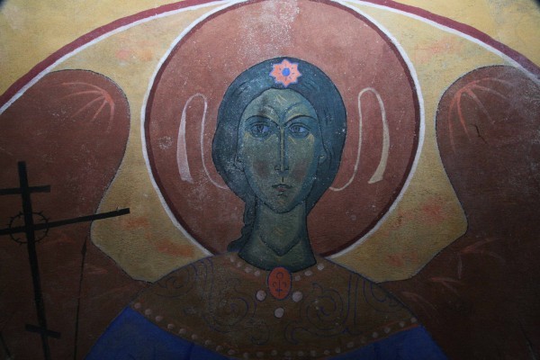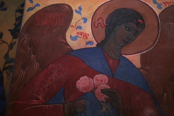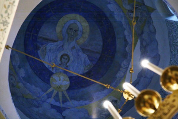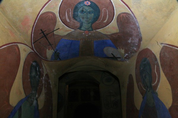 Потолок и своды украшены пылающими серафимами, что составляет яркий контраст с голубоватыми ликами ангелов и мафориями жен.