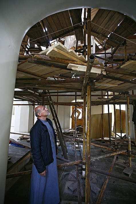 На полу стоят банки с краской, еще не убраны строительные леса. Роспись не завершена.