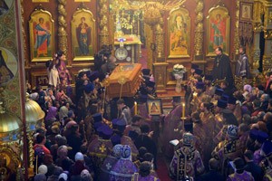 Во время торжественного пения величания священномученику Никодиму, его честные мощи были вынесены священнослужителями из алтаря и поставлены на кафедре, где митрополитом Иоанном коленопреклонно перед ними были прочитаны молитвы.