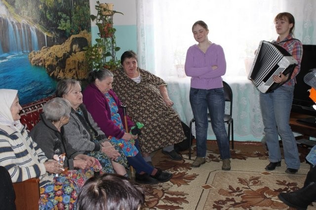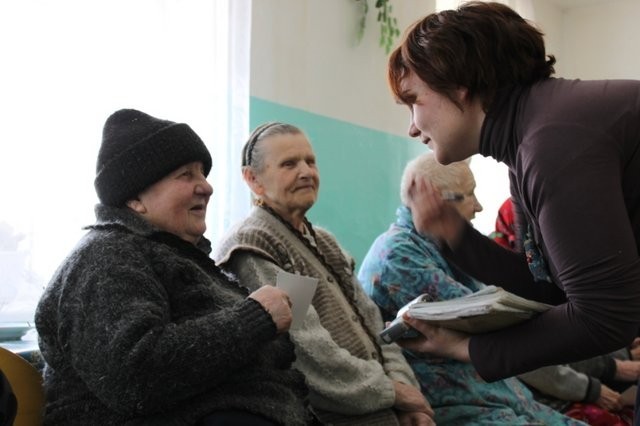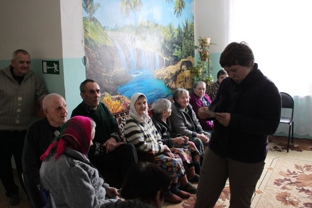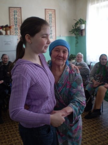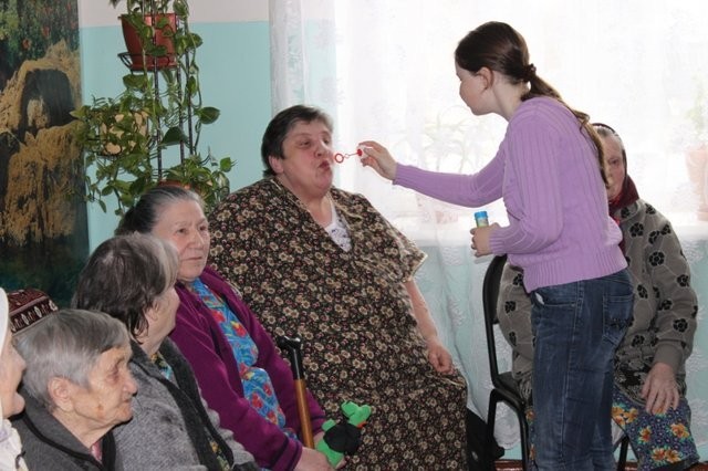 Здравствуйте, меня зовут Елизавета, мне 23 года, по специальности я преподаватель, но занимаюсь в основном волонтерством. Мы помогаем бабушкам и дедушкам, живущим в домах престарелых: навещаем их, поем с бабушками и дедушками песни, дарим подарки, привозим самое необходимое.