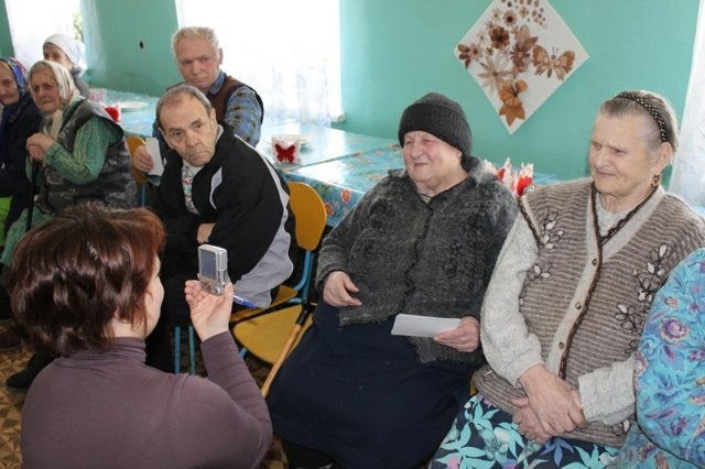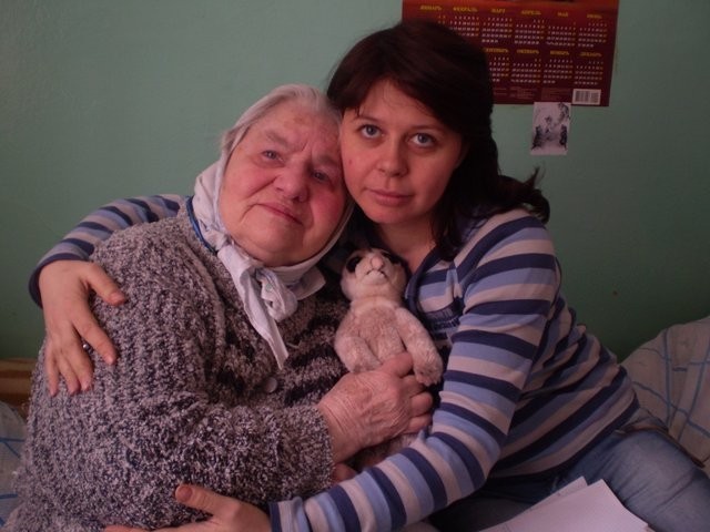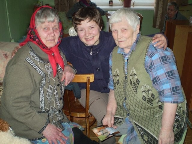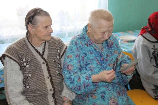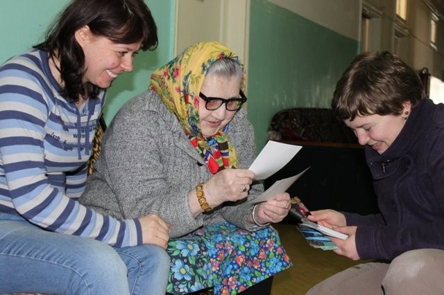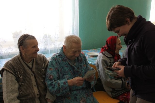 Марина раздает фотографии, которые мы сделали в прошлой поездке. Бабушки ждут их и очень радуются, потому что со времени попадания в дом-интернат их семейные альбомы пополняются только с нашими приездами.