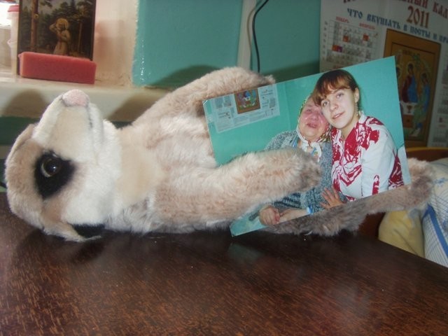 Перед отъездом захожу к ней попрощаться и вижу на тумбочке такую композицию, не смогла пройти мимо: фото со мной с прошлого раза для верности оказалась в лапках у вновь подаренного зверя.