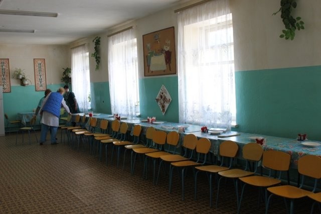 Санитарки созывают проживающих и превращают столовую дома престарелых в актовый зал.