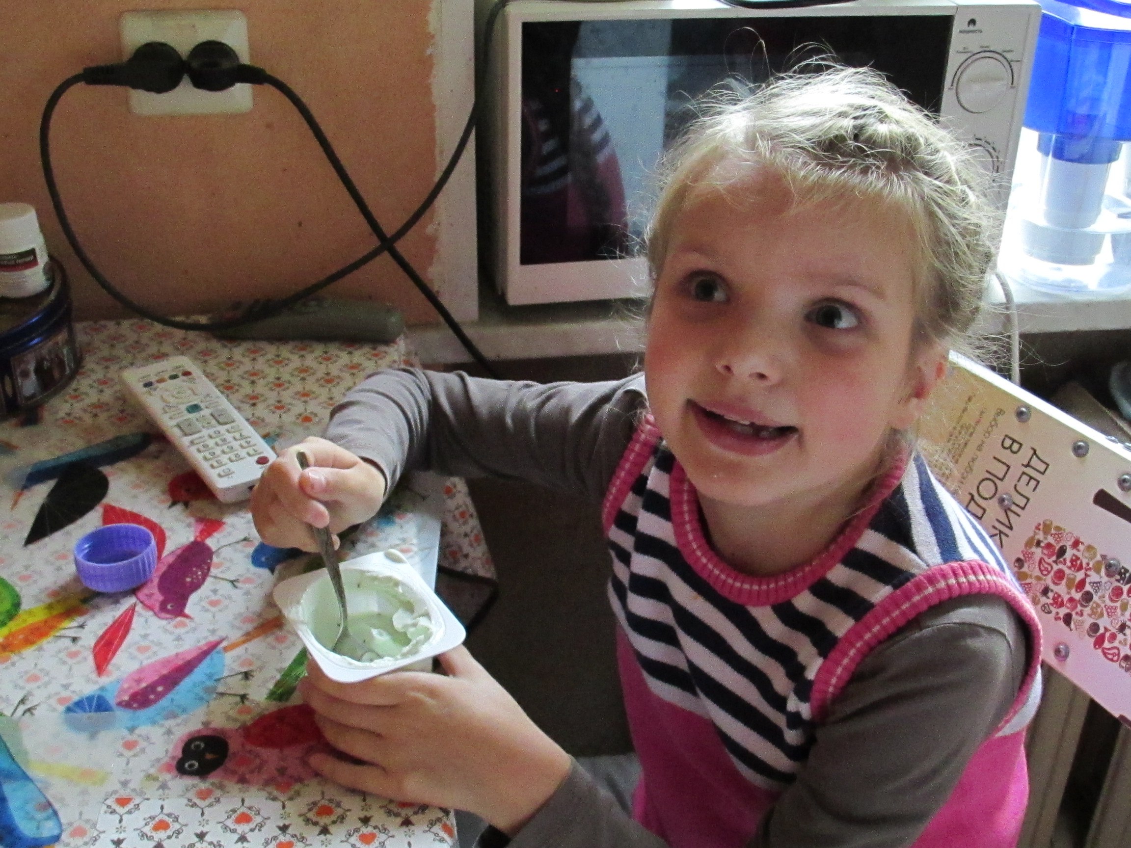 Завтрак. У Лизы овсянка и сливочный йогурт. Детей с муковисцидозом нужно кормить по принципу 3+3, три основных приема пищи плюс три перекуса. Можно чаще.