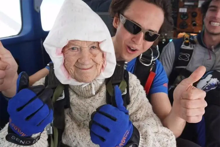 Пожилая женщина является самой возрастной парашютисткой в мире. Свой первый прыжок она совершила в собственный столетний юбилей. Своим новым прыжком она установила новый мировой рекорд.
