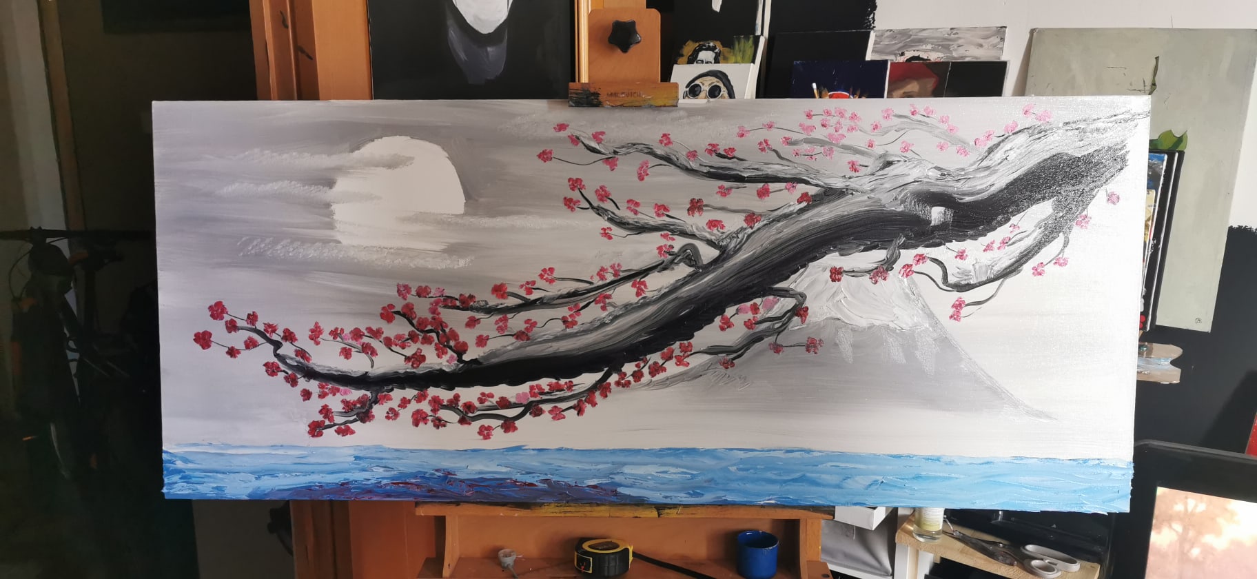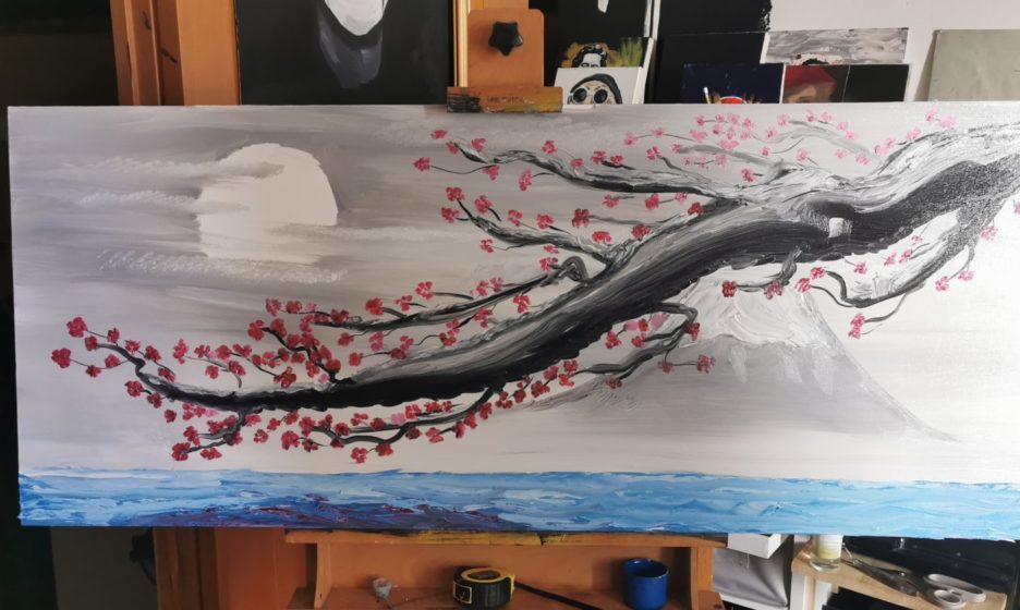 — Сейчас очень люблю синий. Получаю удовольствие, когда веду по холсту синим цветом, а через некоторое время издали это уже напоминает море. Люблю японскую тему, прекрасный розовый, нежный тон. Недавно журавля написал — самому понравилось.