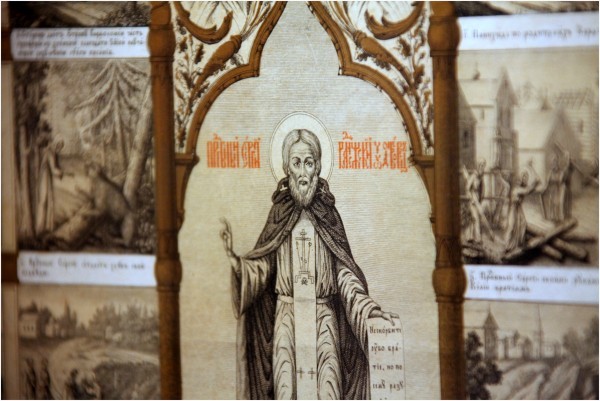 Иконография преподобного Сергия предоставлена на выставке в виде деисусной иконы рубежа XV и XVI веков, ионы-пядницы с ростовым образом преподобного, в серии эстампов, изданных в лаврской мастерской, а также достаточно подробно в памятниках декоративно-прикладного искусства.