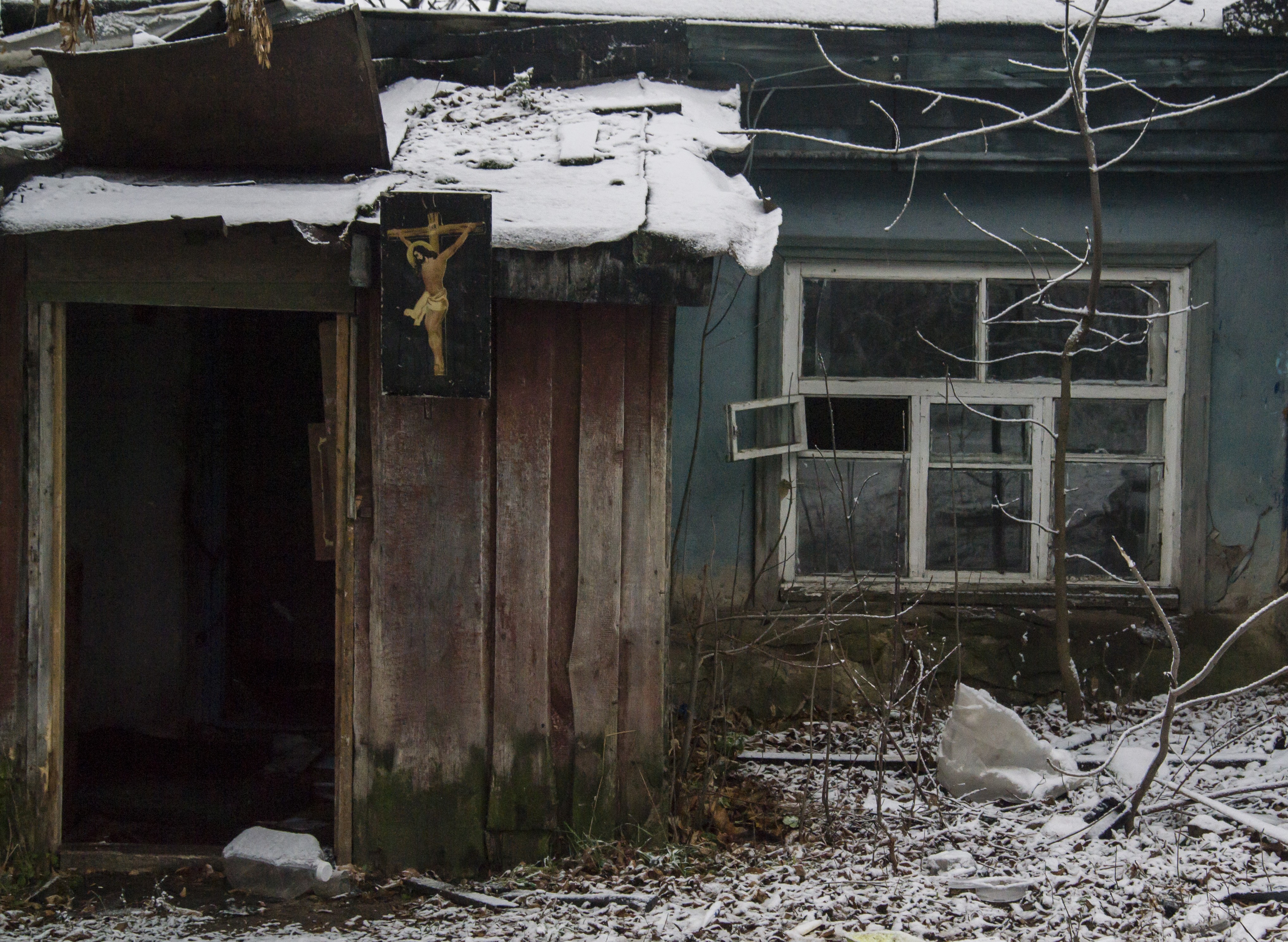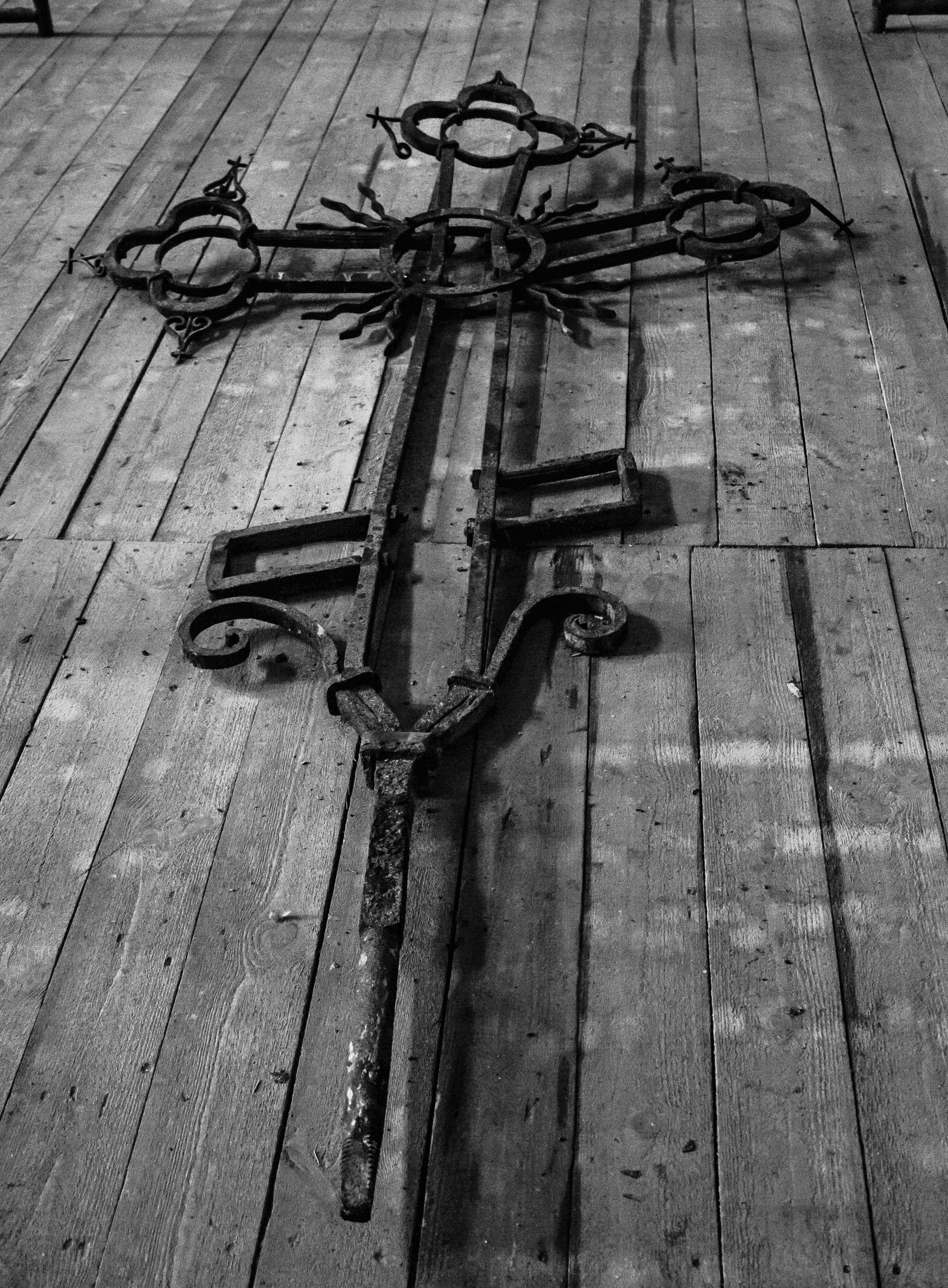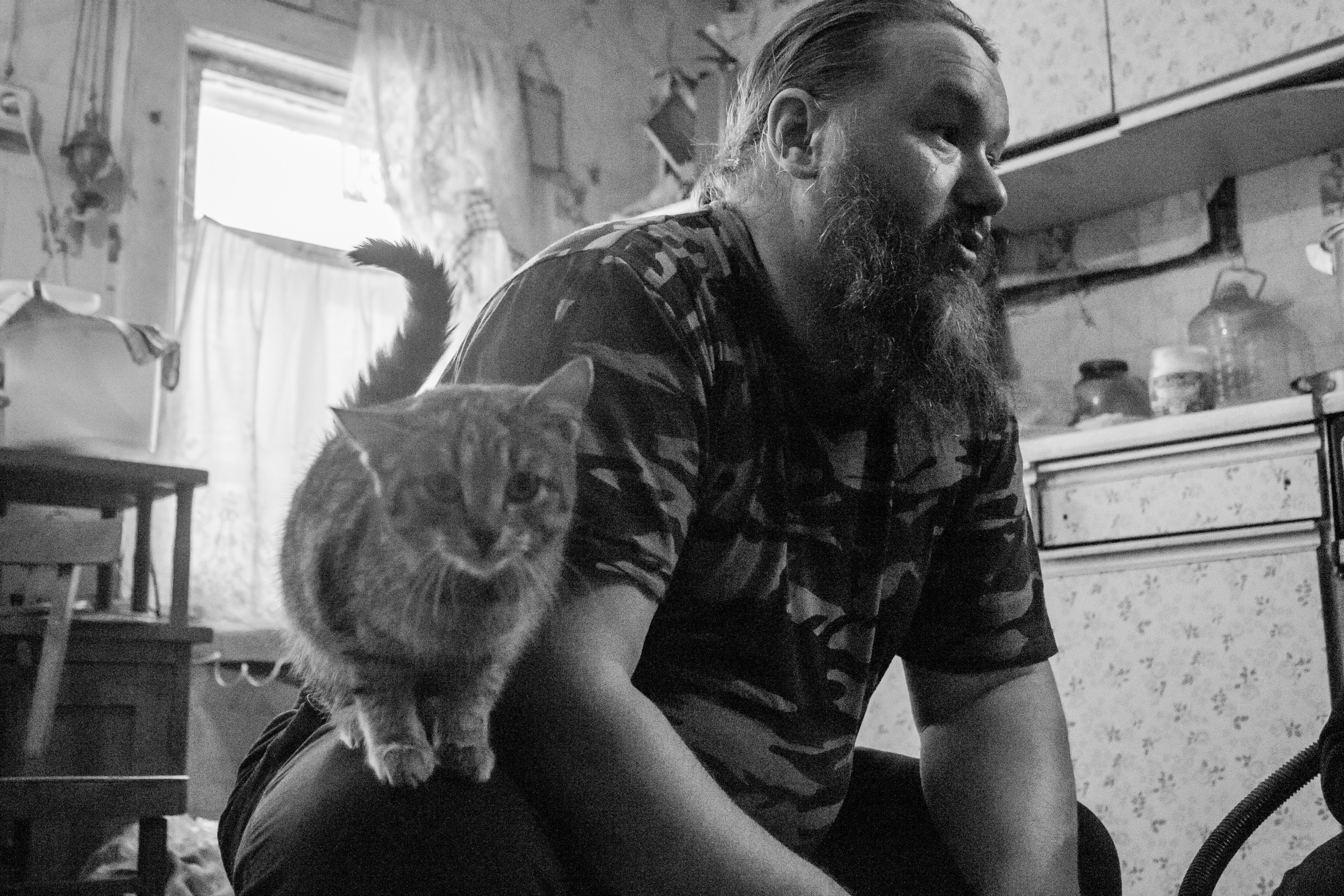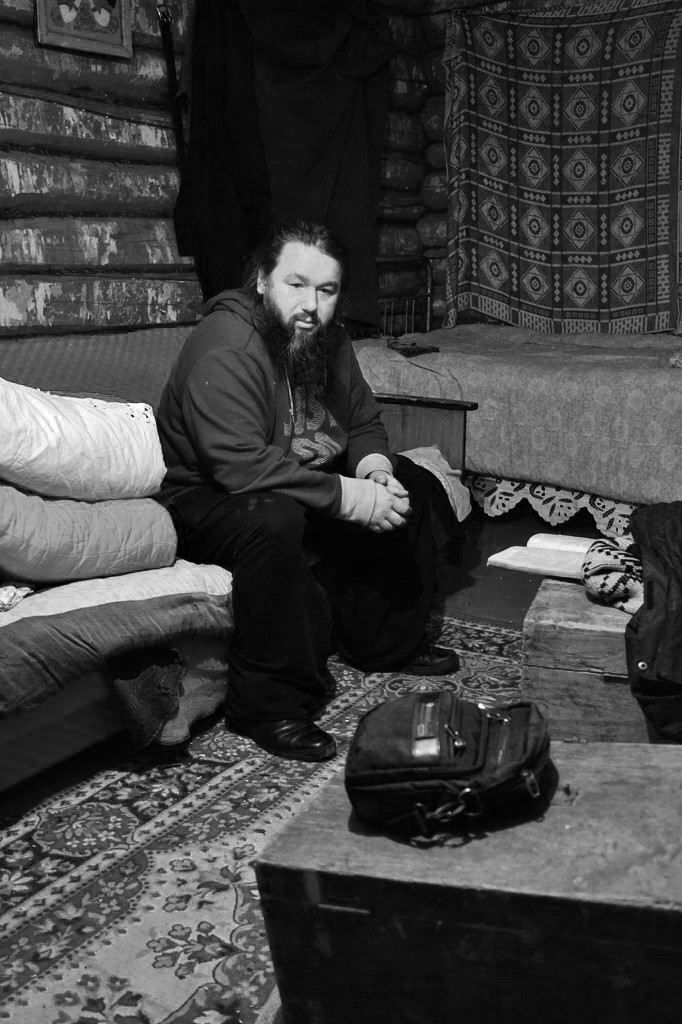 Ночью топим голландку, кидаем чурбаки, расколотые пополам, они шипят, белая пена на краешках. Ветер звенит плохо закрепленным стеклом. Батюшка под иконостасом из собранных по заброшенным избам образов читает Псалтырь.