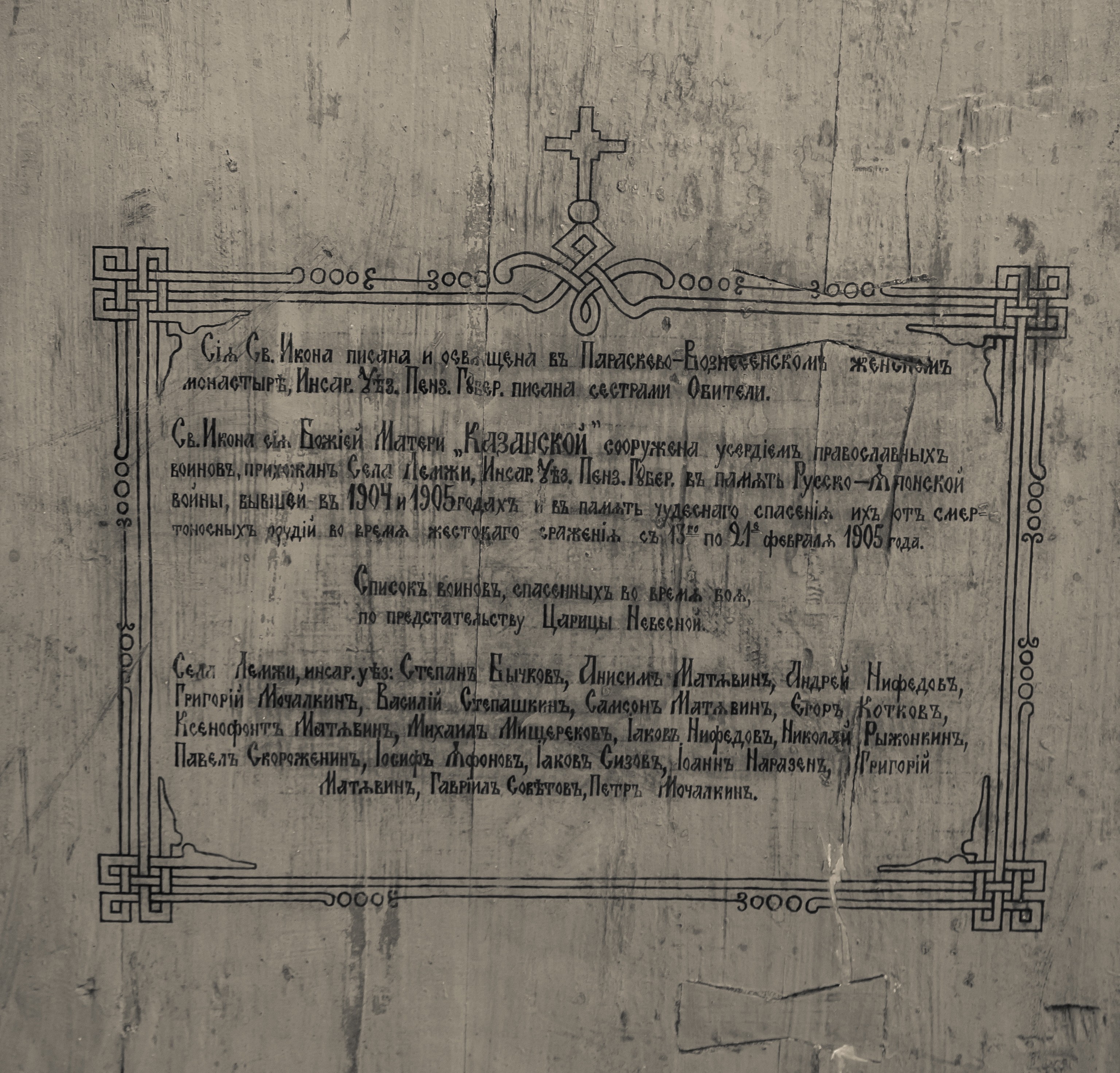 Два года назад, 4 ноября, в день Казанской Иконы Божией Матери, мы совершили с ней крестный ход и стали ее в храм заносить. Неожиданно хмурое осеннее небо озарили солнечные лучи. На оборотной стороне иконы вдруг проявилась надпись, в которой значилось, что лик был написан в память воинов, спасшихся во время жестокого сражения с 13 по 21 февраля 1905 года под японским Мукденом. Представляешь? Страшная была бойня. Сто шестьдесят тысяч погибших. Уроженцы села, которые там сражались, тогда и пообещали, если выживут, то закажут икону. И вот фамилии 18 тех человек проступили. А тут потомки их стоят. У всех огромные мурашки побежали по спине.
