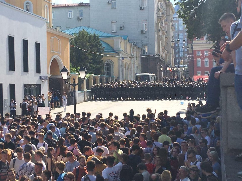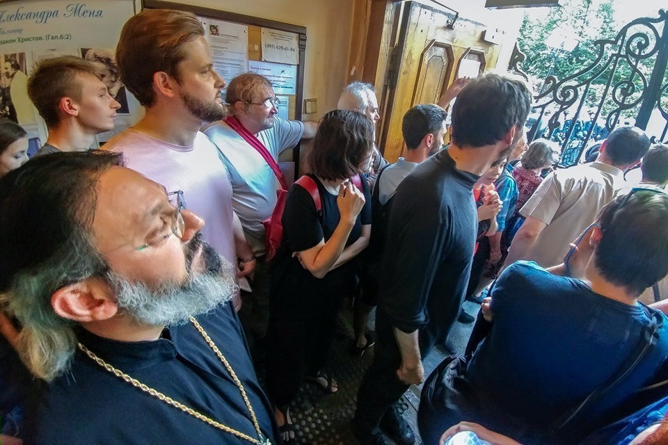 У входа в храм было очень много разного народа, в том числе стройные ряды ОМОНовцев на некотором расстоянии. Во дворе храма тоже была необычная картина: спасаясь от дубинок ОМОНа (которые, как известно, могут не разбирать правых и виноватых, активных участников митинга или просто им сочувствующих или проходящих мимо), люди перелезали через забор или мелкими шажками шли по отвесной стене, цепляясь за тот же забор.
