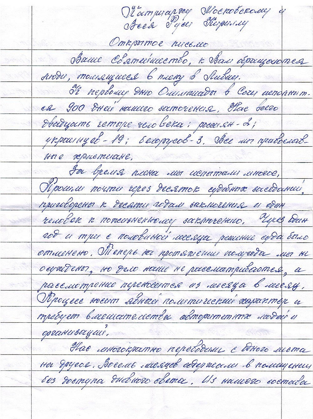 «Мир Вам. Простите, пожалуйста, за беспокойство, отправляю Вам ОТКРЫТОЕ письмо наших соотечественников, томящихся в ливийском плену. Письмо я забирал лично две недели назад, когда их посещал. Есть большая просьба его опубликовать, чтоб попросить Ваших читателей помолится об этих несчастных людях…