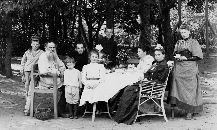 Лев Толстой в кругу семьи. 1892 г. Слева направо: Миша, Лев Толстой, Лев, Андрей, Татьяна, Софья Андреевна Толстая, Мария. На 1-м плане Ванечка и Александра. Государственный музей Л. Н. Толстого