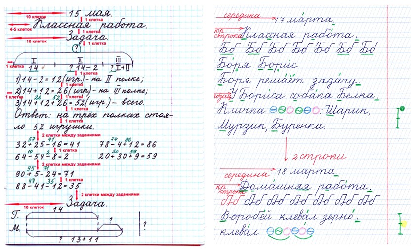 — Зачем в первом классе уделяется столько внимания оформлению? «Чтобы сразу приучить, а то…» Ок, давайте приучим сразу интегралы решать? Почему-то мысль о том, что семилетний ребенок не может решать интегралы, очевидна. А мысль о том, что он НЕ МОЖЕТ просто в силу возрастных особенностей упомнить все эти алгоритмы: четыре клеточки сюда, а если на последней строке, то не начинаем, а если не поместилось, то вот так… И все это надо делать одновременно с собственно письмом и думаньем!
