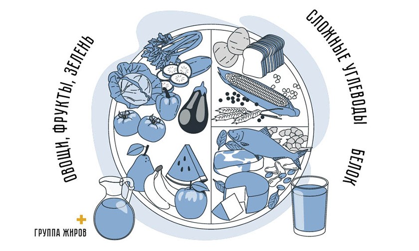 Эндокринолог-диетолог Мария Герасимова рекомендует строить рацион по принципу гарвардской тарелки. Половину порции на один прием пищи должны составлять овощи (два ваших кулака), четверть — сложные углеводы (один кулак), еще четверть — белок (размером с вашу ладонь), также в качестве заправки к гарнирам и салатам используются жиры.