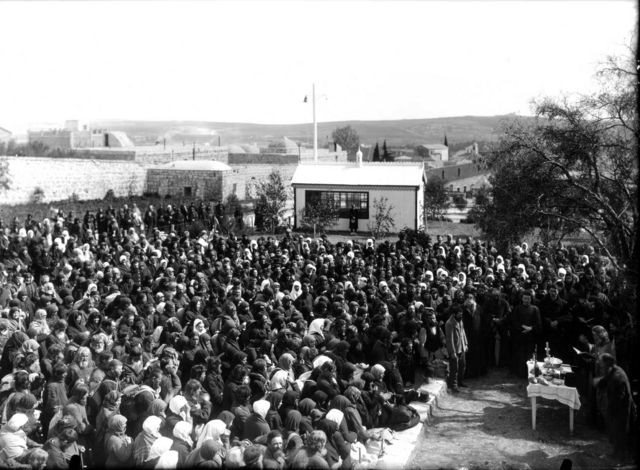 В четвертом часу ночи возвращались мы по пустынному Иерусалиму в Миссию. А в девять часов утра архимандрит Никита привез нас на вершину горы Елеон. Гора Елеонская, или Масличная. Господь часто посещал эти места и любил там уединяться в ночное время для молитвы, о чем свидетельствует евангелист Лука: И, выйдя, пошел по обыкновению на гору Елеонскую, за Ним последовали и ученики Его (Лк 22:39). Елеон имеет три вершины: южная называется Горою соблазна оттого, что там во время заблуждений Соломона совершались языческие жертвоприношения, северная вершина Елеона носит название Малой Галилеи оттого, что во время Спасителя на ней было малое подворье галилеян, там они останавливались, приходя в Иерусалим на праздники, третья вершина — восточная и самая высокая — это Гора Вознесения.