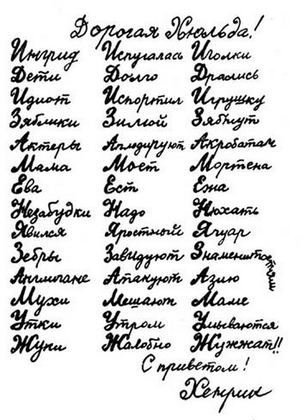 — Ты напиши только: «Дорогая Хюльда!», а дальше напиши столбиками все эти предложения и каждое слово начинай с большой буквы, а внизу напишешь: «С приветом! Хенрик».