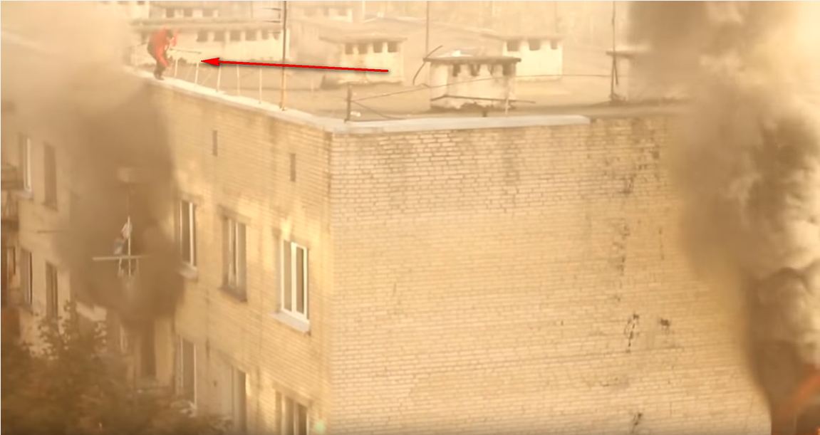 На второй минуте видео появляется Олег. Он в красной куртке. Парень прыгает с крыши дома на балкон. Подхватив ребенка, возвращается на крышу. Теперь малыш в безопасности. Остальных жителей квартиры уже через несколько минут эвакуируют спасатели — по автолестнице.