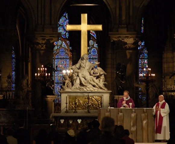 В храмах много листовок и брошюр, по которым видно, что католическая жизнь Парижа не дремлющая, но активная. Плотные объявления о службах, исповедях. Службы есть григорианские (видно, по древнему чину) и интернациональные (не знаю, что это). Есть лекции на тему «Христос – Слуга и Господь», «Гефсиманская скорбь», «Вечная Евхаристия». Висят карты и указатели, где можно причаститься и когда. Книги Люстижье. В основном о молитве и литургии. Знаки папских посещений – и Бенедикта, и Войтылы. «Париж стоит мессы», как сказано однажды, но и мессу до сих пор любят в Париже.