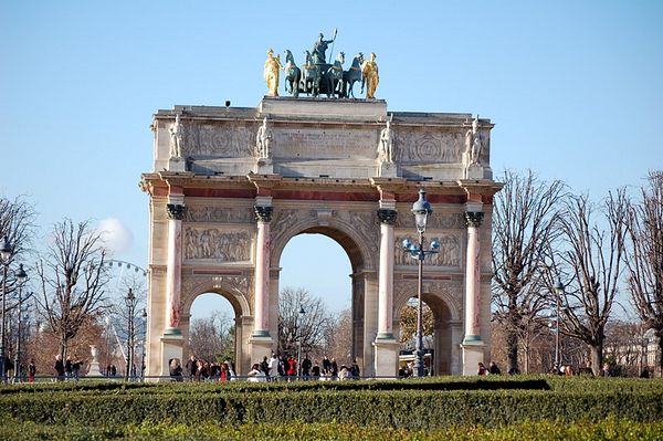 Возле Триумфальной арки присаживаемся, ища отдыха натруженным ногам. Здесь широта. Здесь Елисейские поля, знакомые по песне Джо Дассена. Триумфальная арка (как и Нотр Дам вместе с Эйфелевой башней) поверху, как мушками, облеплена туристами. Они всюду лезут повыше, как те карлики с памятника 1789 года, что само по себе, может, и неплохо, раз стало частью пейзажа. Хочется человеку сверху посмотреть раскинувшееся море крыш. Хочется, видно, сразу увидеть весь Париж, но не умереть, как в пословице, а продолжить жить и цокать языком при воспоминаниях.