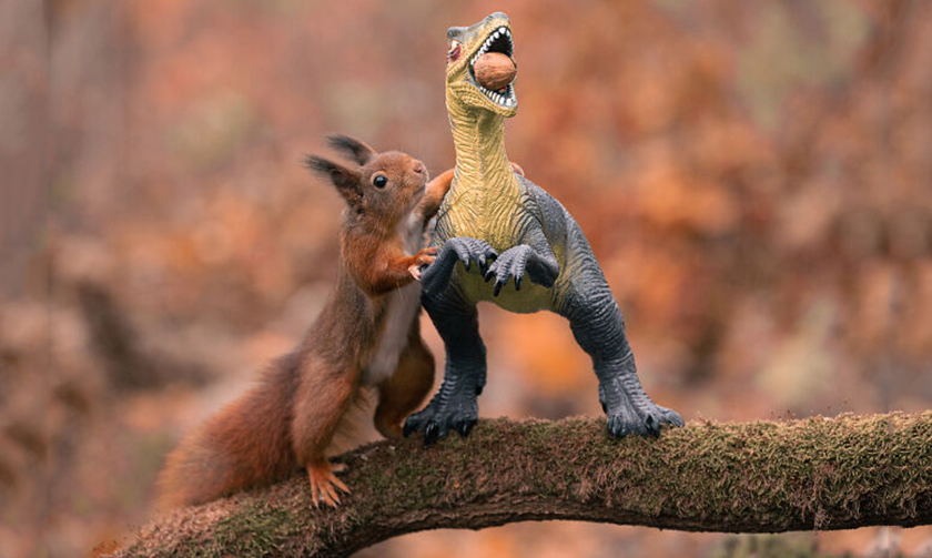 Фотограф Ники Колемонт в детстве увлекался динозаврами. У него была энциклопедия о древних ящерах, игрушки и надувные динозавры. Потом вышел фильм «Парк Юрского периода», и Ники решил объединить в одной фотосессии своих любимых динозавров и белок. Получилась целая история о том, как древний ящер пытается украсть у милого грызуна самое дорогое…