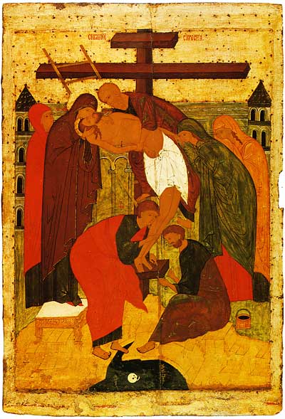 Вся икона исполнена трагизма, но не в статичности, не в покое – а в движении. Путь Богоматери и мироносиц, устремленных ко Христу, умершему и снимаемому с Древа, словно пресекается встречным движением Христа, уже «нагого Мертвеца» (Канон на Плач Богородицы) и опускаемого на землю.
