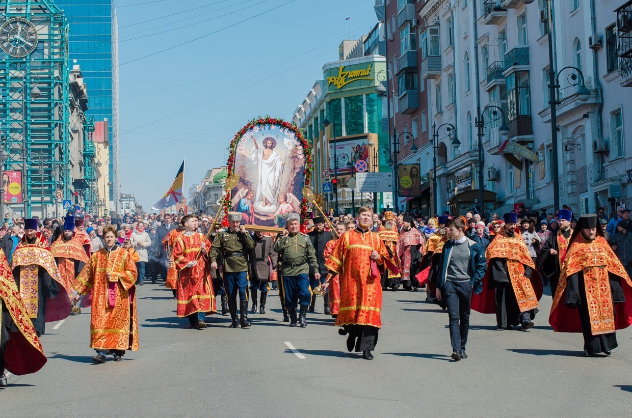 Люди в красных одеяниях, священник, и все поют «Христос воскресе!» Идущие мимо люди останавливались, замирали, кто-то присоединялся, многие из них впоследствии стали прихожанами храма, это было, действительно, преображением их душ.