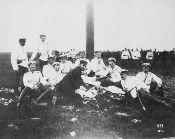 Проходит полчаса. Напились и враги. Почему-то решаю пробрать своих людей. Отнимаю бинокль от глаз — предо мною солдатик, тот самый, что задержался на лугу дольше всех.
