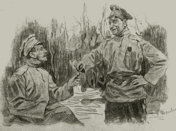 Один только солдатик еще на лугу. Что-то держит бережно в одной руке, а другой машет перед неприятельскими окопами.