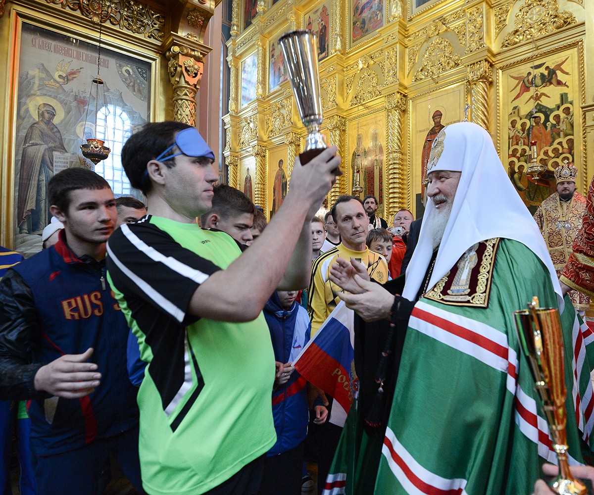 22 мая. ПРАВМИР. В праздник перенесения мощей святителя и чудотворца Николая из Мир Ликийских в Бар Святейший Патриарх Московский и всея Руси Кирилл по окончании Божественной литургии в Преображенском соборе Николо-Угрешского ставропигиального мужского монастыря вручил кубок победителя команде России, победившей в Международном турнире по футболу среди незрячих, а также кубки «За волю к победе» командам Украины и Белоруссии, сообщает пресс-служба Патриарха Московского и всея Руси.