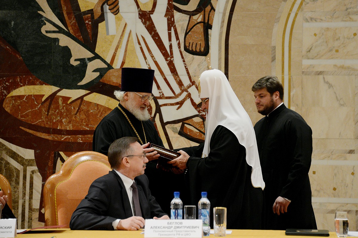 В ходе торжественной встречи Патриарх Кирилл вручил диплом доктора церковной истории доценту кафедры истории ПСТГУ священнику Александру Мазырину.