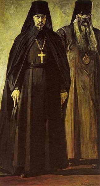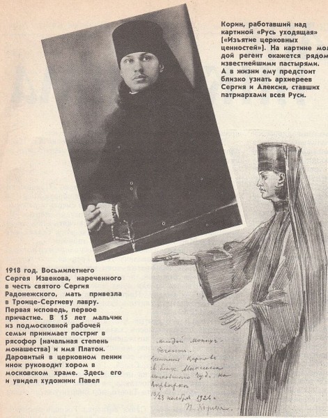 После кончины Святейшего Патриарха Тихона художник Павел Корин по совету своего учителя художника Михаила Нестерова приступил к созданию картины «Русь уходящая». На ней должны были быть изображены предстоятели уходящей Руси – монахи, священнослужители. Художнику удалось сделать всего несколько эскизов к этой картине. На одном из эскизов запечатлен будущий Патриарх Пимен. Этот портрет почти не имеет фотографического сходства. Но Корину удалось передать внутреннее содержание будущего Патриарха. Он представлен как светоч веры. Художнику удалось увидеть великое предназначение этого человека.