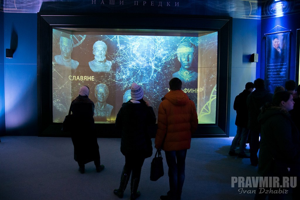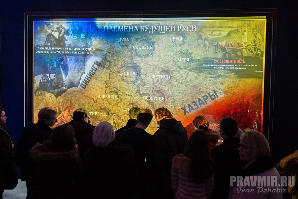 Рюриковичи. Прогулка по выставкеЧасть информации выведена на интерактивные экраны, где зритель сам может выбрать, что смотреть – реконструкции, иллюстрации или исторические справки.