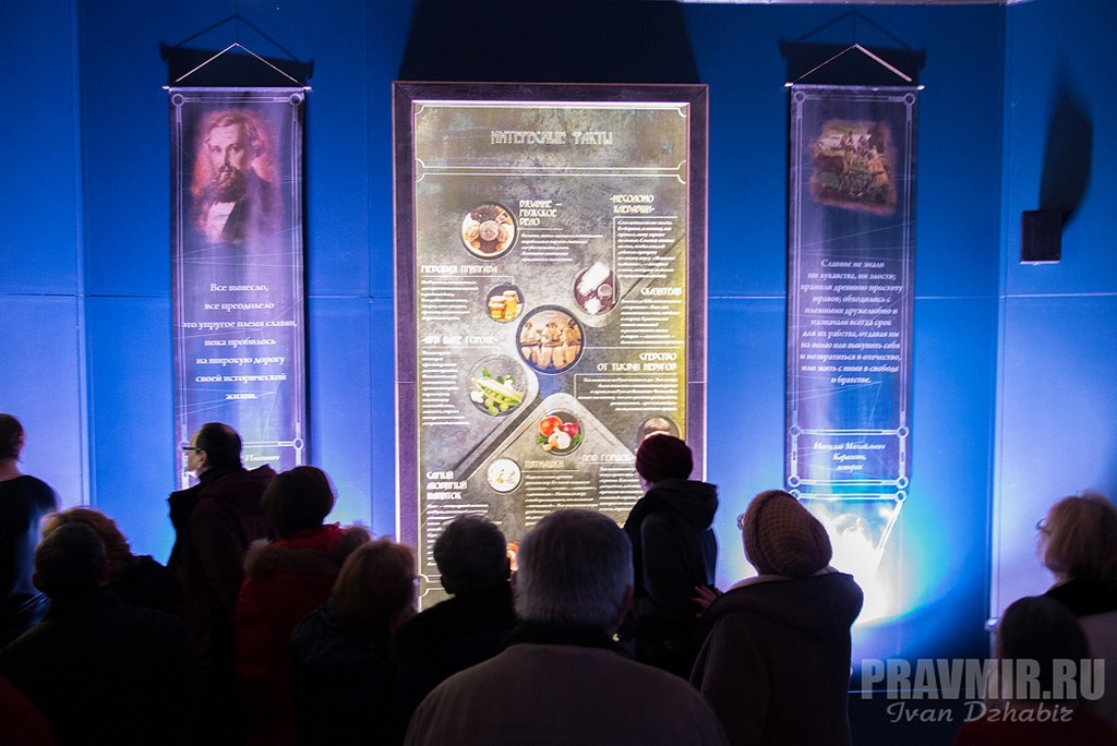 Например, здесь есть рассказы о чёрном хлебе, варежках, редьке, квасе и гречневой крупе, которая получила своё название за то, что была заимствована от греков. Повествуют стенды даже о гусельной музыке, которая, по мнению устроителей, была целебной.