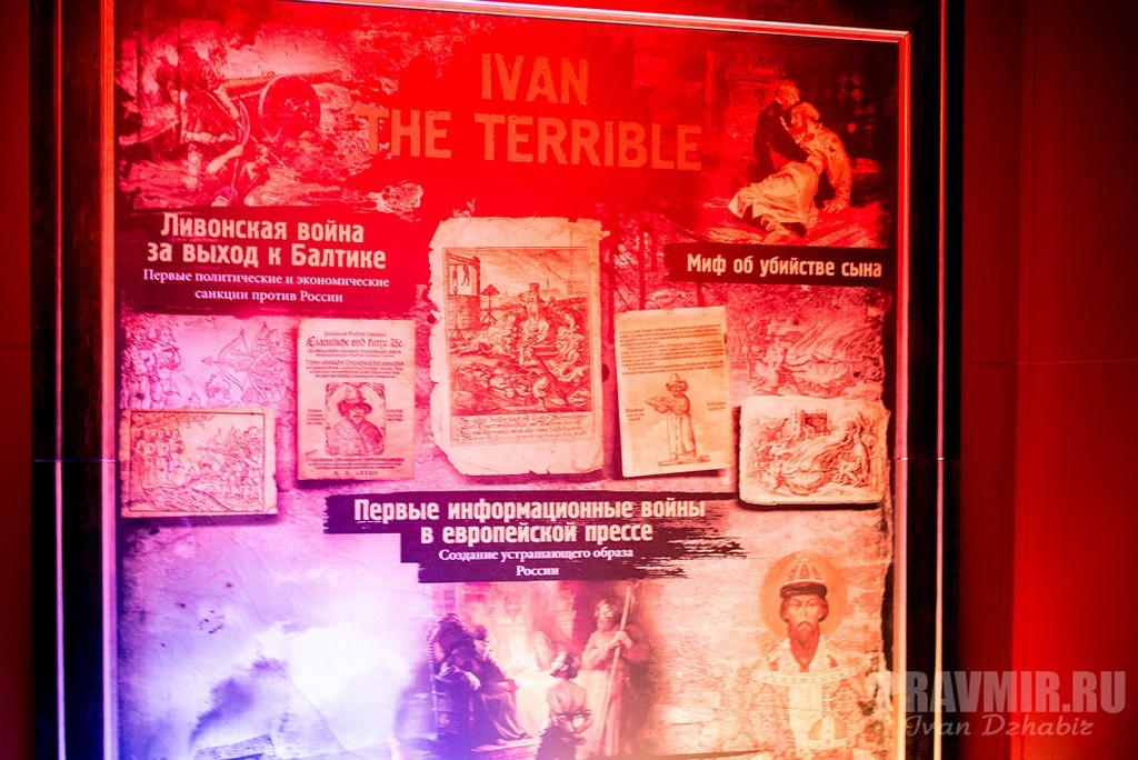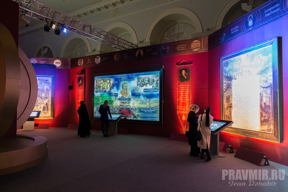Развёрнутая в Манеже экспозиция поражает своими масштабами. Более четырёх тысяч квадратных метров, восемнадцать интерактивных залов. Информационные стенды и цитаты классиков отечественной историографии на стенах.