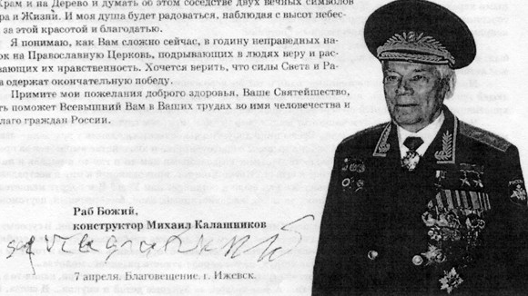 Легендарный оружейный конструктор, создатель автомата АК-47 Михаил Тимофеевич Калашников, скончавшийся 23 декабря 2013 года, за полгода до смерти написал Патриарху Московскому и Всея Руси Кириллу покаянное письмо (есть в распоряжении «Известий»). В нем конструктор делится с главой РПЦ душевными переживаниями и сомнениями по поводу своей ответственности за смерти людей, убитых из автомата, который он создал.
