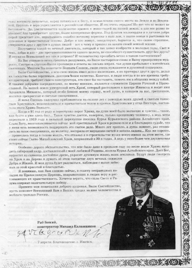 — Это письмо было очень уместным во время нападок на Церковь. Патриарх поблагодарил легендарного конструктора за внимание и позицию и ответил, что Михаил Тимофеевич являл собой пример патриотизма и правильного отношения к стране, — отметил Волков.