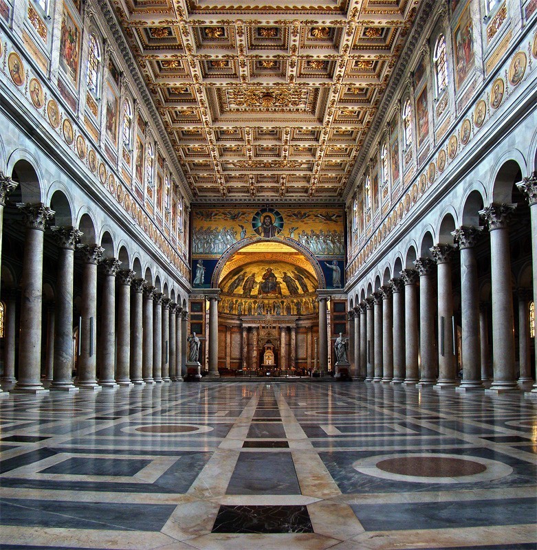 Потом ты возьмешь такси или дойдешь до метро и поедешь в южную часть Рима в базилику Сан-Паоло-фуори-ле-Мура (святого Павла за городскими стенами). Там ты тоже сначала ничего не почувствуешь. Небольшой, но пышный садик с пальмами, прямые и витые колонны, само здание – очень красивое и как будто совсем новое несмотря на очевидно древнюю фреску наверху. Даже высокая белая статуя Павла сначала затронет исключительно эстетические чувства. Впечатляет, большое спасибо.