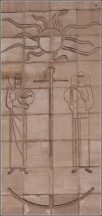 Недалеко от креста бывшая судорембаза. На ней панно. Вроде как крестьянин со снопом и рыбак с рыбой. Вглядываешься и понимаешь — иконописные какие-то рыбак с крестьянином на этом панно. Михаил улыбается: «Молодые мы были тогда, в 80-х, задорные. Поступил нам заказ на панно для судорембазы, а тут как раз в гости приехали мои приятели, московские художники — Володя Мосин, Сережа Любаев и Саша Гнеушев. Вот и увековечили они так святых равноапостольных Петра и Павла, пусть и „под прикрытием“, стоящих по обе стороны креста в виде якоря — старинного христианского символа. Никто из заказчиков так ничего и не понял, зато в Маэксе свои Петр и Павел теперь есть».