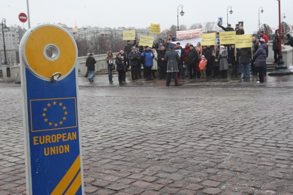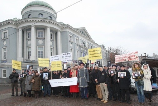 50 человек собрались 31 декабря в 11.00 на Кадашевской набережной напротив здания представительства Евросоюза в Москве. Большую часть и них составляли члены Фонда Андрея Первозванного, а также партнеры Фонда по организации принесения в Россию из Ватопедского монастыря на Афоне Пояса Пресвятой Богородицы.