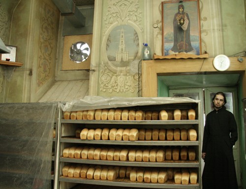 Лаврская пекарня находится в бывшем притворе храма, поэтому на стенах здесь росписи. Каждый день тут выпекают 450 буханок белого хлеба – для братьев, паломников, рабочих, семинаристов и преподавателей Духовной семинарии и академии. Тесто замешивают машиной. Однажды пекари только поставили поднявшийся хлеб в электрические печи, как вдруг безо всякого предупреждения отключили электричество. Для тех, кто имел когда-нибудь дело с тестом, понятно, чем это грозило – поднявшийся хлеб должен был упасть, и даже если потом снова начать его печь, это будет уже не хлеб, а головешки.