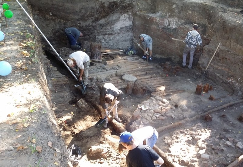 Итак, место действия – археологические раскопки на территории будущего парка «Зарядье», на месте бывшей гостиницы «Россия». Находка – мостовая Великой улицы, ведшей от Константино-Еленинских ворот Кремля к пристани на Москве-реке. Как пишут авторы пресс-релиза, «уже верхние слои показали, что археологи оказались на трассе улицы Великой (т.е. Большой): почти всю ширину раскопа (6,5 метров) занимают бревна верхнего яруса мостовой (XVII-XVIII веков), на которую местами легли остатки первого каменного подмащивания. Из-под этого яруса видны бревна более ранних уровней».