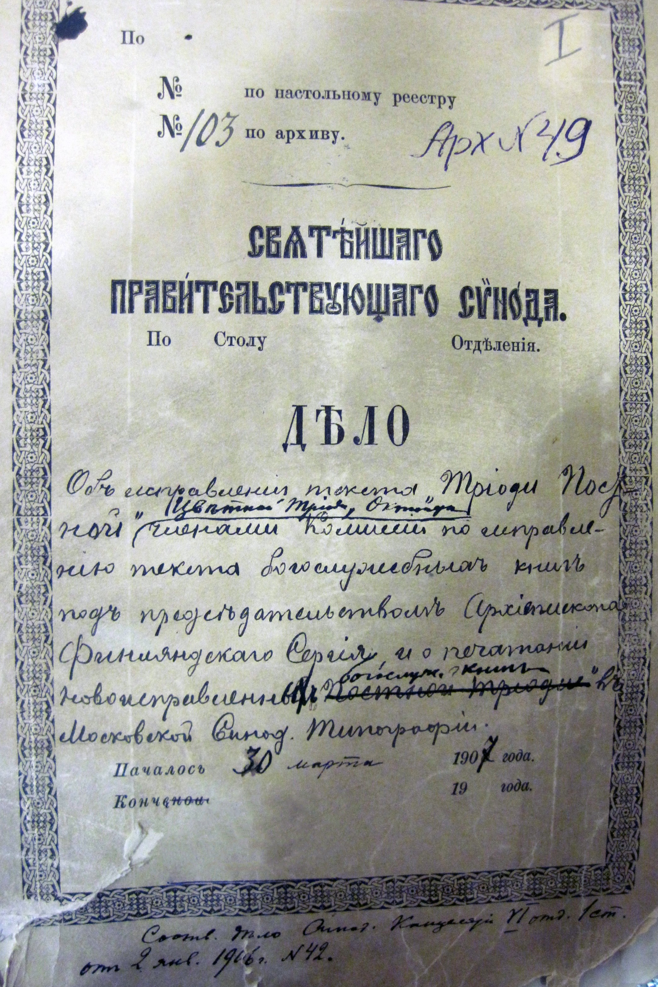 Александр Кравецкий: Комиссия еп. Сергия начала свою работу в 1907 году. В 1912 году была напечатана исправленная Постная Триодь, в 1913 году — Цветная Триодь. Комиссию консультировало множество специалистов очень высокой квалификации. После Триоди исправили Октоих, затем должны были править Минеи. И если в Триоди они боролись с чрезмерно греческим синтаксисом, то в Минее пытались бороться, наоборот, с русизмами, пытаясь сделать некий усредненный стиль.