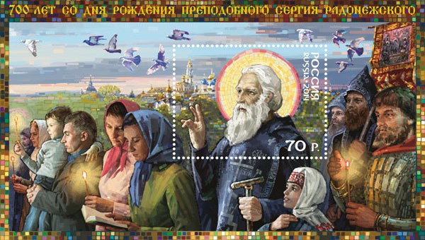 На почтовом блоке изображен крестный ход во главе с преподобным Сергием Радонежским на фоне Свято-Троицкой Сергиевой лавры, в небе — стая голубей (последователей и учеников Сергия), — сообщает Официальный сайт Почты России