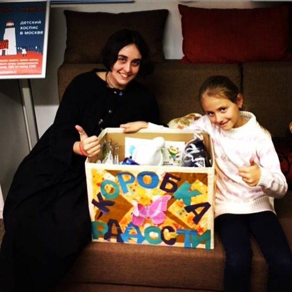 «Сфотографировались с Яной и ее коробкой радости. Несколько дней назад Яне исполнилось 7 лет. Яна – волонтер Детского хосписа. В течение года Яна почти каждую неделю навещала Алину, свою ровесницу, подопечную хосписа. Алина жила на аппарате ИВЛ. Яна ложилась с ней рядом в кровати, и они вместе играли, рисовали и даже пели.