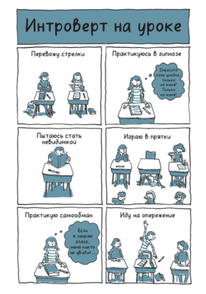 Нежелание подавать голос не всегда связано со страхом, беспокойством или перфекционизмом. Нередко интроверты попросту не хотят болтать попусту (и многие, с кем я говорила, хотели бы, чтобы все люди следовали этому правилу!). В отличие от «думающих вслух» экстравертов мы, интроверты, предпочитаем сначала подумать, а потом уже что-то говорить. Наше умение глубоко сосредоточиться на той или иной теме — настоящий дар. Но когда учитель неожиданно вызывает нас, мы буквально застываем, ведь нам некогда было подготовиться! Часто мы, интроверты, уделяем так много внимания содержанию и ясности наших ответов, что предпочитаем помалкивать, а не брякать что ни попадя. Иногда к тому времени, когда мы мысленно сформулируем нужный ответ, дискуссия уже заканчивается.