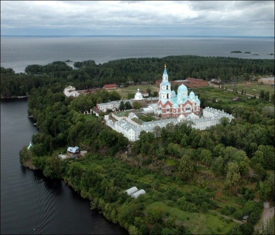Иногда часть нашей «бригады» добиралась до Валаама из СПб вертолетом, либо вместе со Святейшим, либо вторым бортом. В таких случаях ребята договаривались с летчиками, чтобы во время полета те сделали кружок-другой сначала над Коневецким островом (как раз над ним пролегал маршрут полета), а потом — и над самим Валаамом. Получались вот такие кадры.