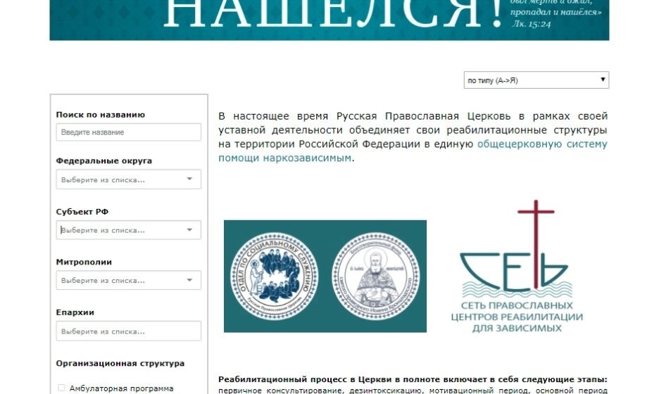 Сервис размещен на сайте церковной помощи наркозависимым protivnarko.ru . С его помощью можно быстро найти по заданным критериям организации, помогающие наркозависимым — на определенном этапе церковной реабилитации, в выбранной епархии или на территории конкретного региона.