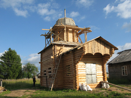 Один из предпринимателей, занимающийся в этом районе лесом, попал в серьезную автокатастрофу. Его жизнь висела на волоске, когда на больничной койке он пообещал Богу, что если выживет — построит храм. Фундамент делали всем миром, причем копать под него яму помогали даже те, кто в церковь не ходит. Корреспондент «НС» стал свидетелем, когда к всеобщей радости в деревне началось долгожданное возведение храма, и он начал расти прямо на глазах.