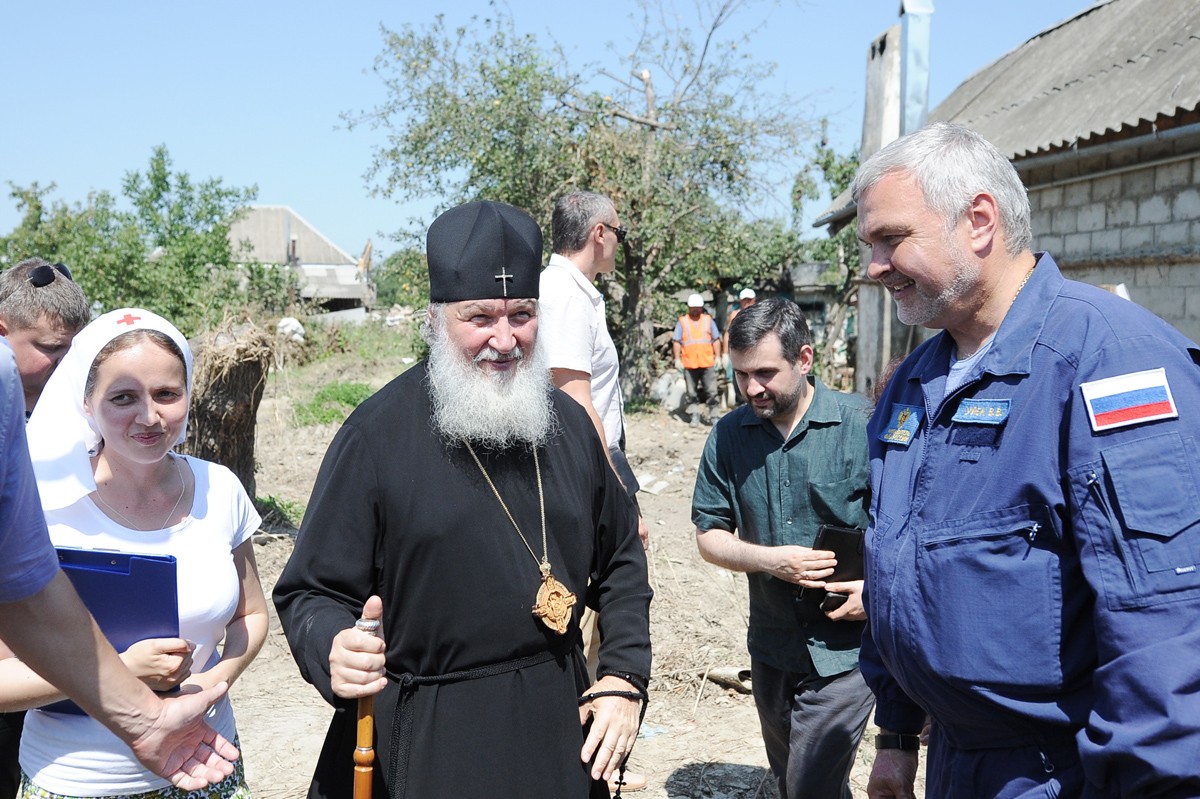 23 июля Крымск посетил Предстоятель Русской Православной Церкви Святейший Патриарх Московский и всея Руси Кирилл. Его Святейшество побывал на улицах города, наиболее пострадавших от стихии, посетил Казанский храм, встретился с пострадавшими крымчанами, а также общался с добровольцами и казаками, которые активно помогали жителям Крымска и занимались распределением гуманитарных грузов, передаваемых Русской Православной Церковью.